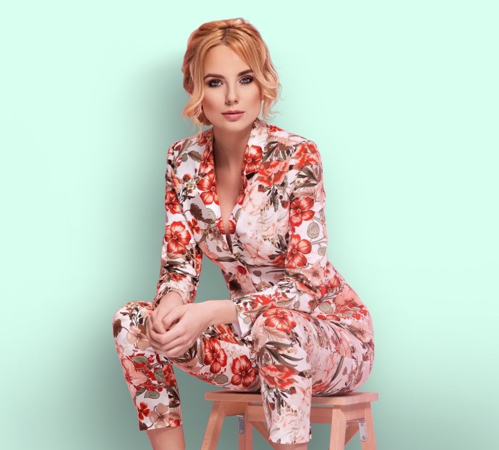 Kadın uzun kollu omuz dekolteli bluz ve palazzo pantolon ikili takım